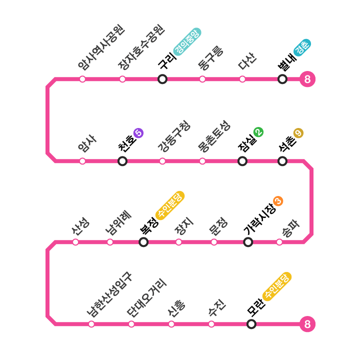 서울 지하철 8호선은 주택 밀집 지역인 강동구 암사동과 천호동, 송파구 가락동과 장지동 지역을 성남시와 연결하는 노선입니다. 이 노선은 부도심과 지구 중심인 강동과 송파 지역의 접근성을 크게 개선하고, 성남 시민이 서울 동남권으로 보다 편리하게 이동할 수 있도록 설계되었습니다.